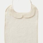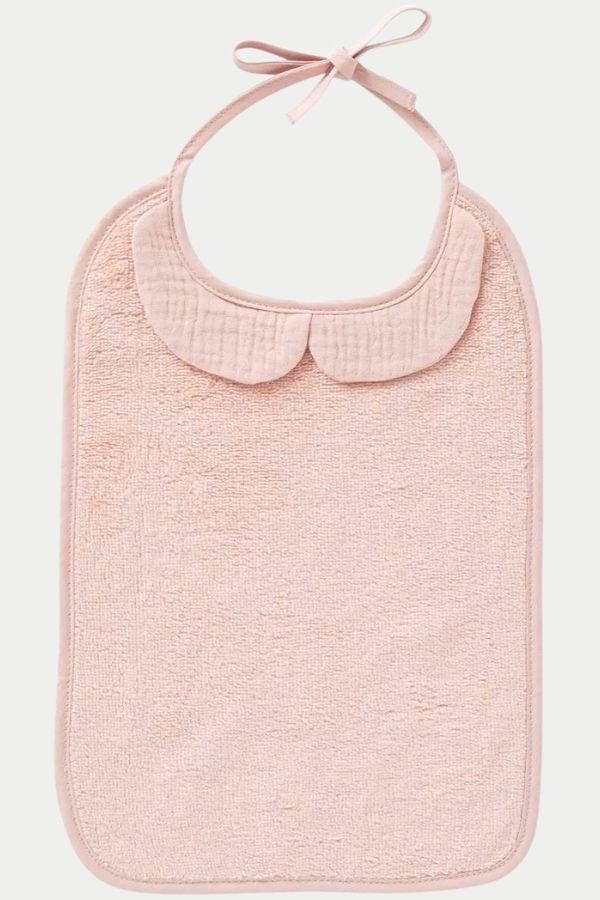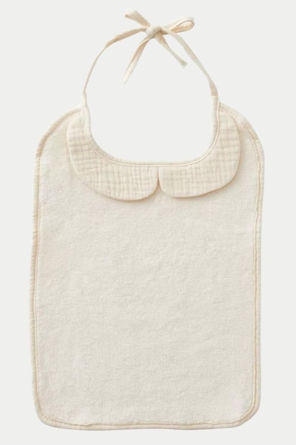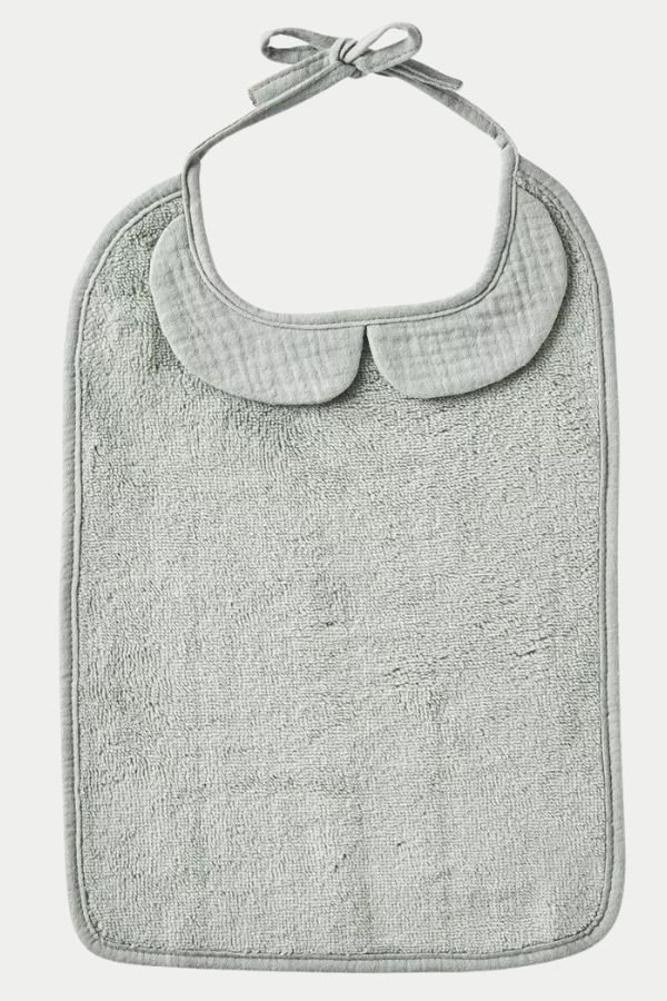 Un babero grande, chic y moderno en felpa de bambú ultra suave, con corbata y elegante cuello en gasa de algodón doble tono sobre tono.