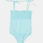 Nuestro bañador más dulce, con estampado vichy verde agua y parte superior tipo nido de abeja con tirantes ajustables con lazadas.