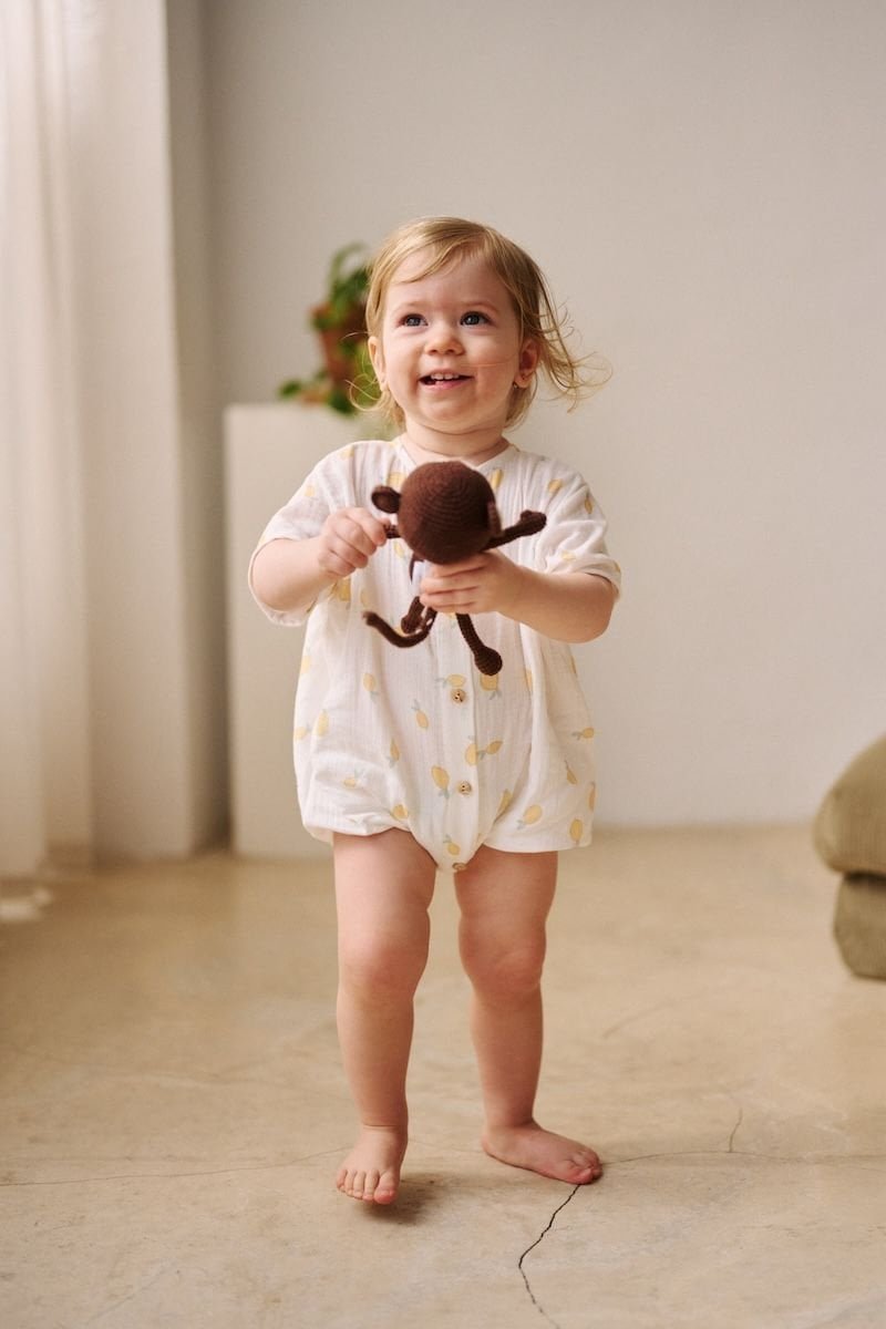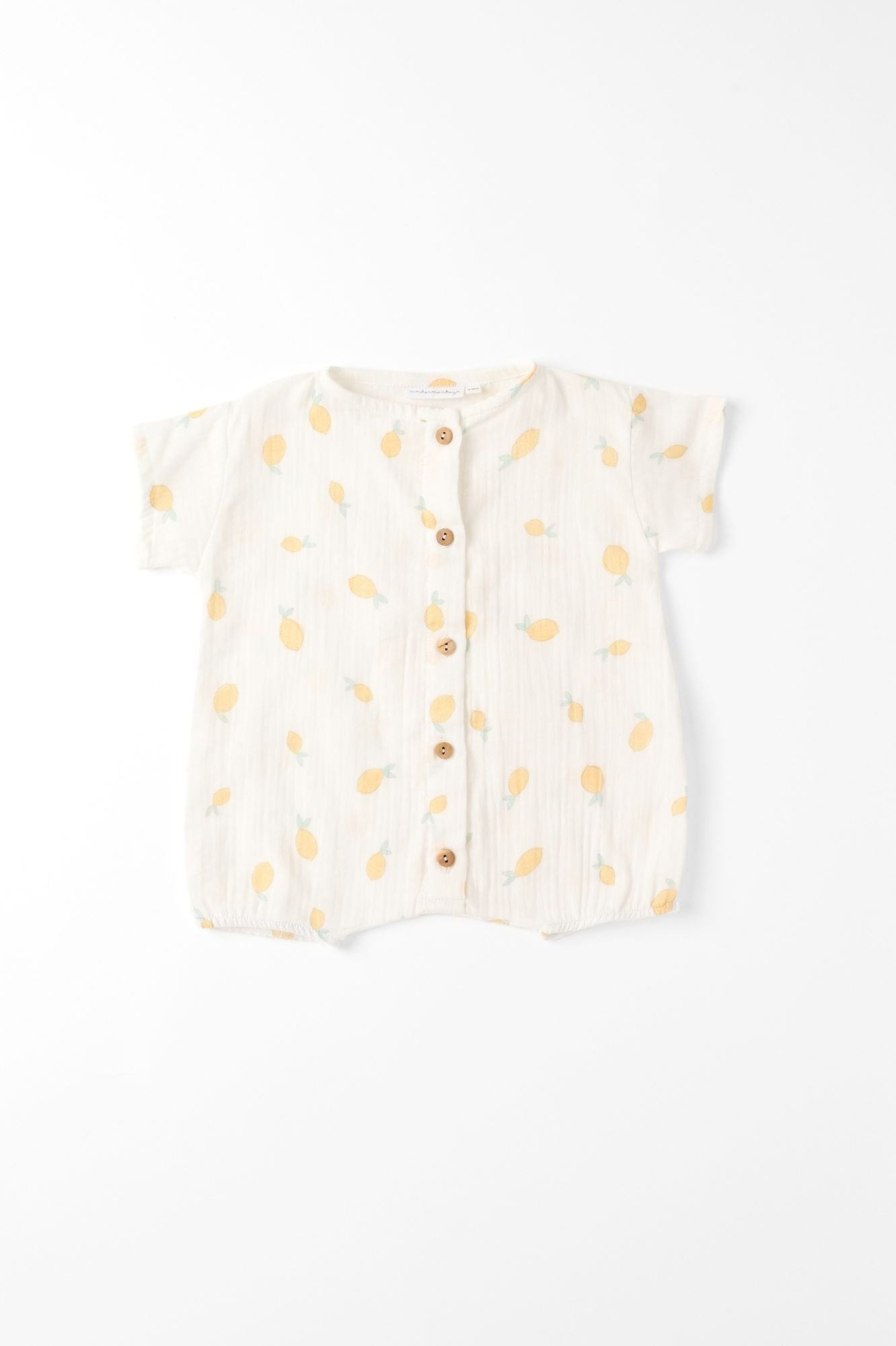 El pelele Limones en tejido bambula es frescura y dulzura en una sola pieza. Su estampado de pequeños limones sobre fondo claro aporta un aire mediterráneo suave y luminoso, perfecto para el verano ☀️